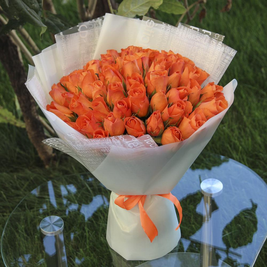 На фото букет из 51 оранжевой розы. В составе: роза 51 шт, дизайнерская упаковка 2 шт, атласная лента 1 шт, . Все цветы свежие и ароматные, букет красиво оформлен и отлично подходит для подарка. Доступна доставка цветов или самовывоз.