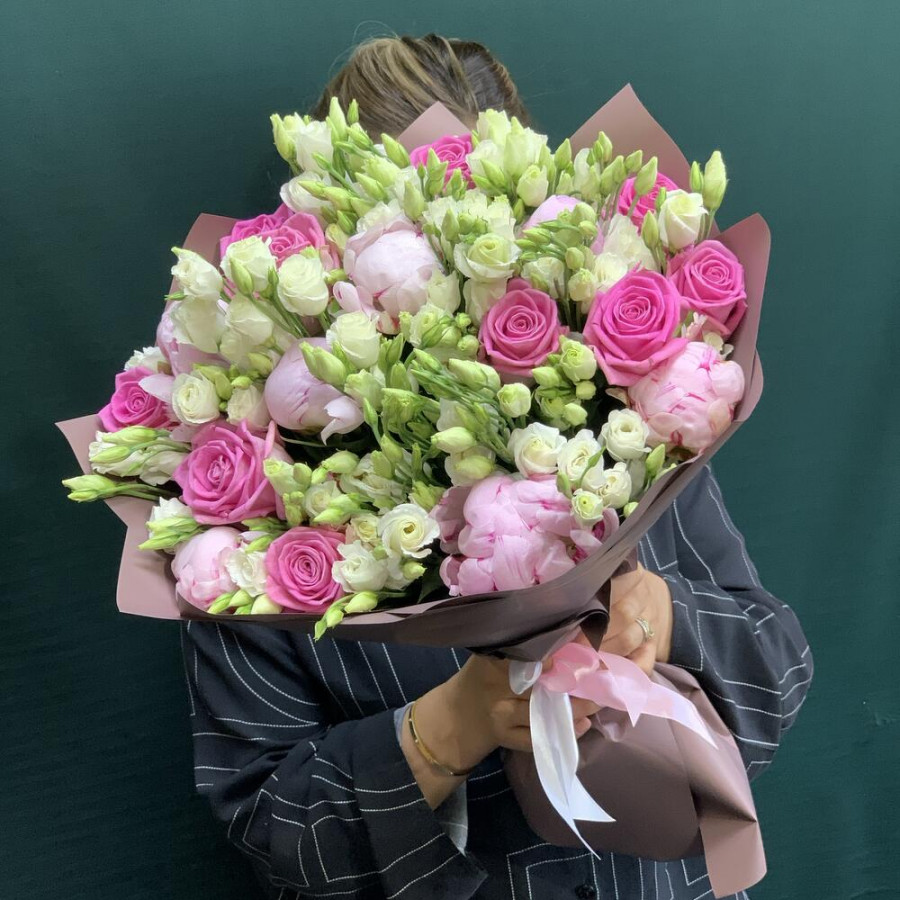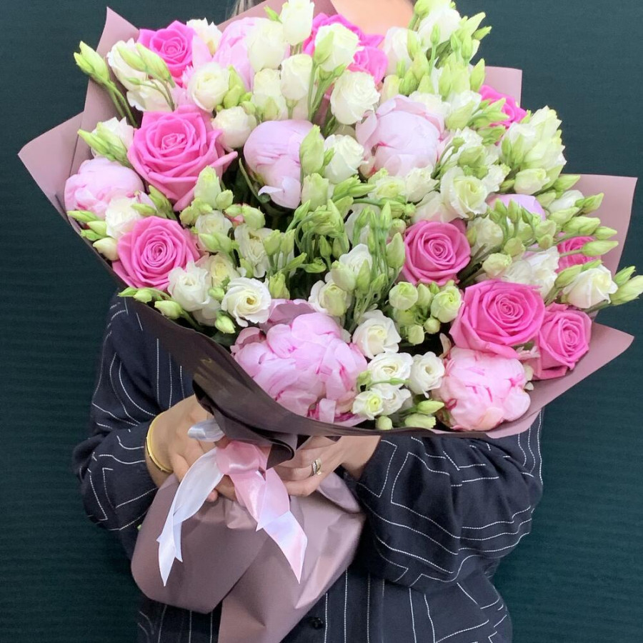 На фото букет «дыхание любви». В составе: роза 10 шт, эустома (лизиантус) 13 шт, пион 7 шт, дизайнерская упаковка 2 шт, атласная лента 1 шт, . Все цветы свежие и ароматные, букет красиво оформлен и отлично подходит для подарка. Доступна доставка цветов или самовывоз.